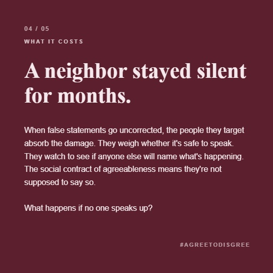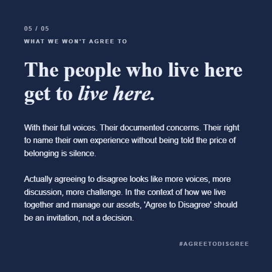 People who live here get to live here — with their full voices, their documented concerns, and their right to name their own experience — without being told that the price of belonging is silence.