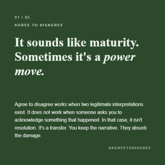 But there is another use of the phrase — one that has nothing to do with taste and everything to do with power. When someone says something false about you, and the response to a request for correction is let's just move on — that isn't resolution. That's a transfer. You absorb the damage. They keep the narrative. The social contract of agreeableness means you're not supposed to say so.