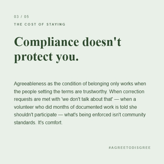 When compliance doesn't protect you, when correction requests are met with we don't talk about that, when a volunteer who has done months of documented work is told she shouldn't participate — then what's being enforced isn't community standards.