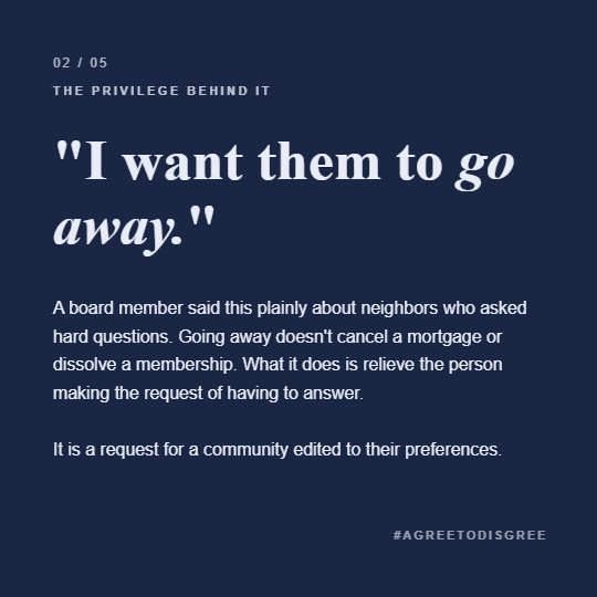 A neighborhood association exists to serve its members — all of them, including the ones asking hard questions, including the ones who lost an election, including the ones who show up to meetings with notebooks and documented research and requests that false statements be corrected.