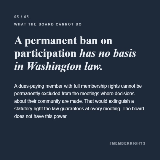 A prohibition on a member's attendance at board meetings would extinguish a statutory right that Washington law guarantees at every meeting. It would mean that a dues-paying member of this association — with full membership rights, financial obligations, and a stake in every decision this board makes — could be permanently excluded from the meetings where those decisions are made.