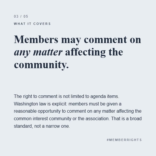 Washington State HOA Meeting Law Overview: https://legalclarity.org/washington-state-law-regarding-hoa-meetings-key-rules-and-requirements/