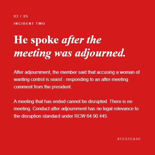 We are asking the board to establish a written, documented definition of disruptive conduct that complies with RCW 64.90.445 and to make that definition available to all members so that everyone has clear notice of the standard being applied equally.