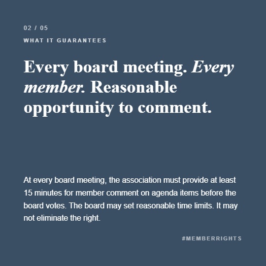 At every board meeting, the board must provide a reasonable opportunity for members to comment on any matter affecting the community or the association. That opportunity must include at least 15 minutes at the beginning of each meeting for members to comment on agenda items before the board votes. The minimum time per member is 90 seconds.