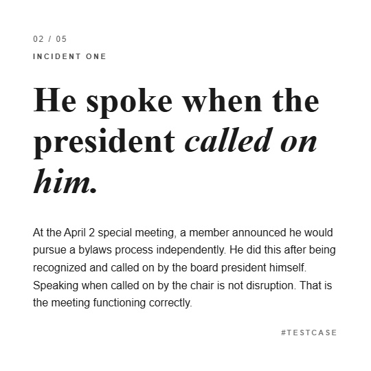 Incident one: A member announced at the April 2 special meeting that he would pursue a bylaws process independently if the board refused to engage with the committee's work. He made this statement after being recognized and called on by the board president himself.